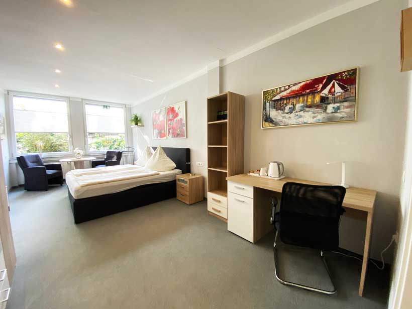Natürlich müssen Sie dabei nicht auf zeitgemäßen Komfort verzichten. Alle Zimmer und Appartements verfügen über einen Schreibtisch, Kabel-TV und schnelles WLAN. Die Badezimmer sind mit Dusche, WC, Föhn und Kosmetikspiegel ausgestattet. Unsere hochwertigen Matratzen garantieren erholsamen Schlaf.
